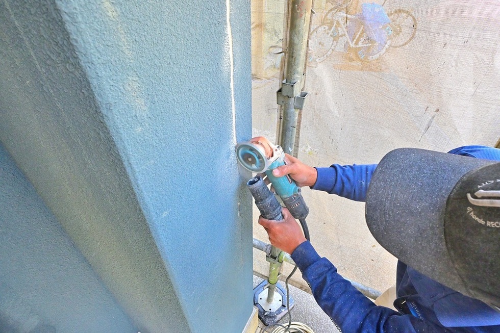 Uカットシール充填工法は、クラックに沿ってディスクサンダーなどで故意にUの字に切り込みを入れてクラックの幅を広げます。