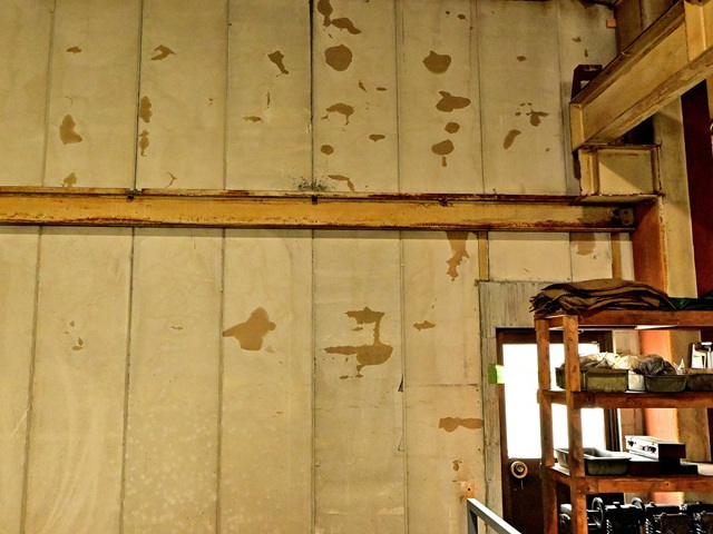 上の写真も工場の室内側から撮影した外壁からの雨漏りの写真になります。