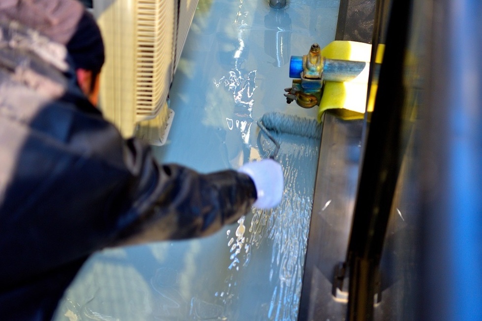今回ひび割れや塗膜の浮きに強いウレタン防水通気緩衝工法で施工しています。