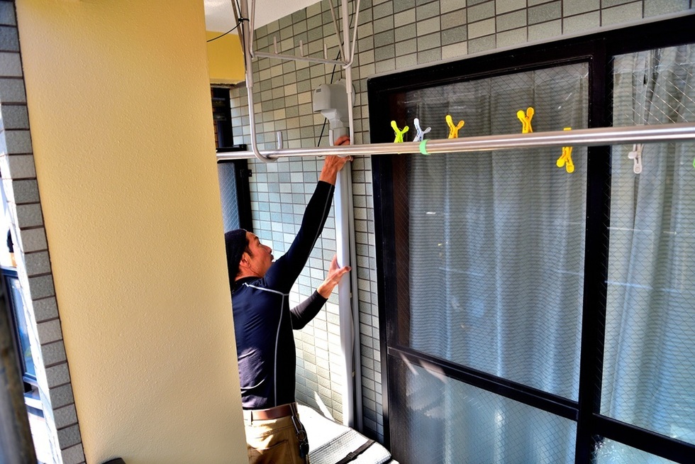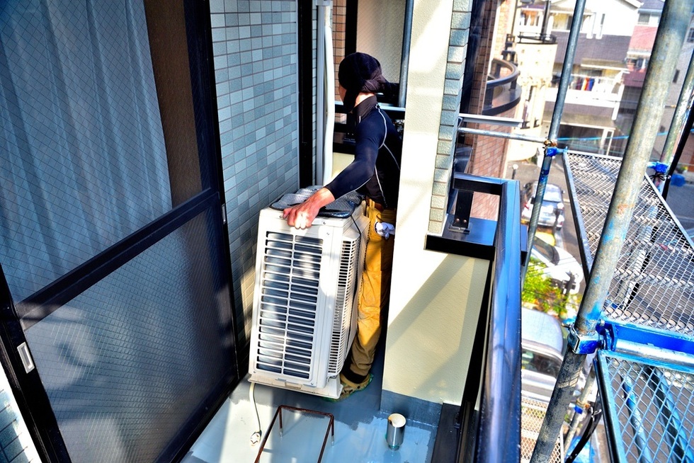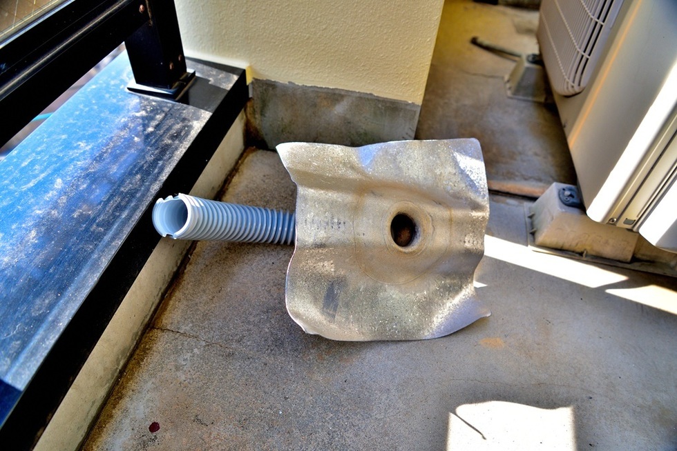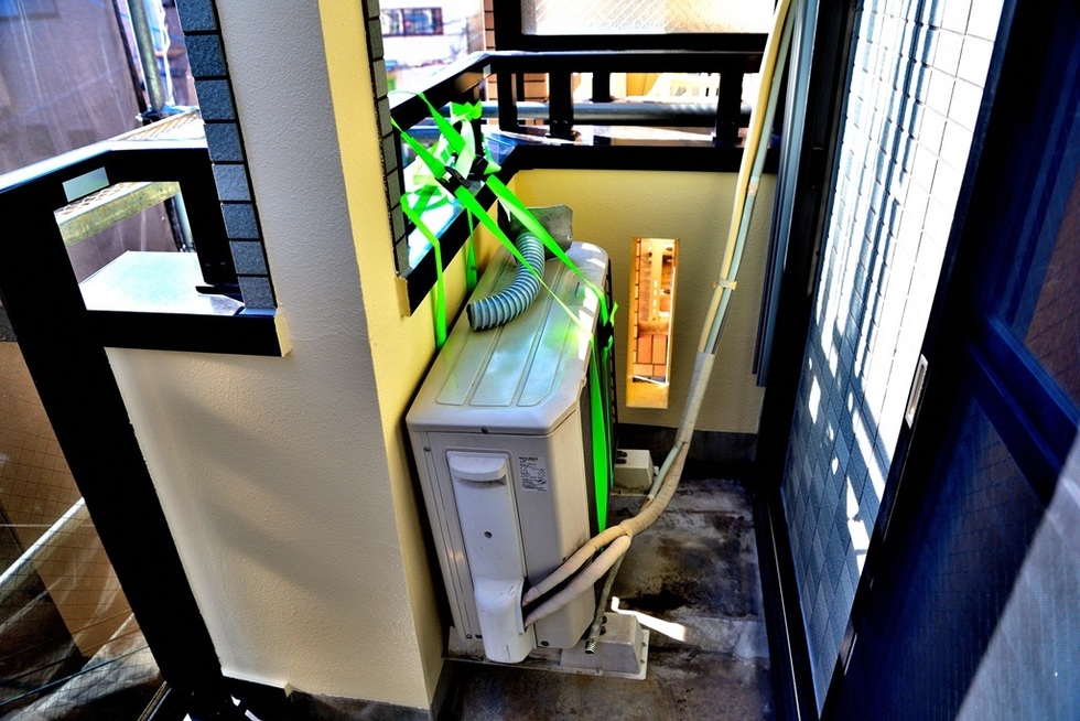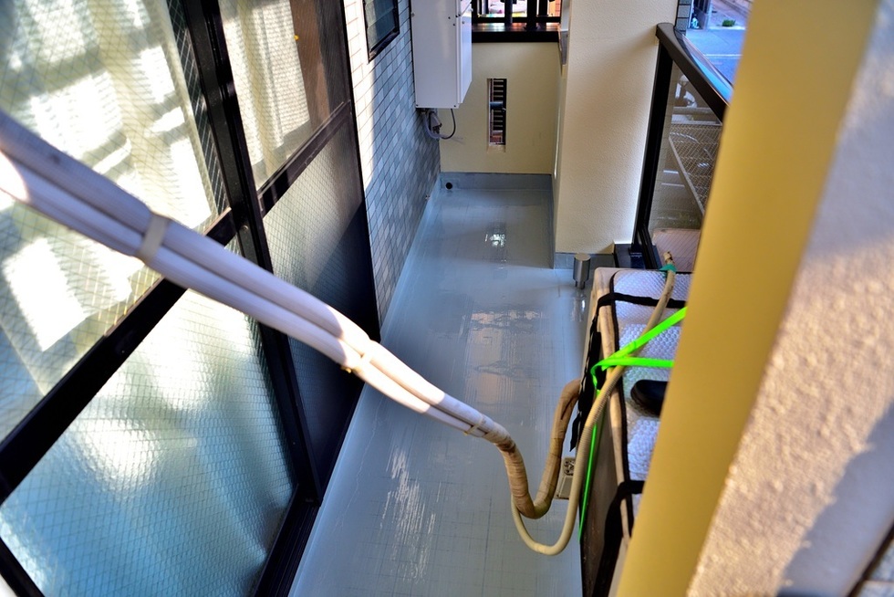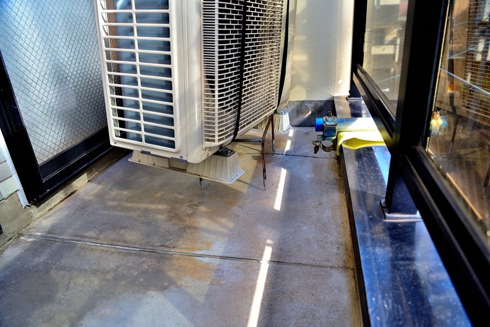 室外機の下もキッチリと防水する為、室外機をベランダの手すりにロープなどを使って吊り下げたり架台を使って浮かします。