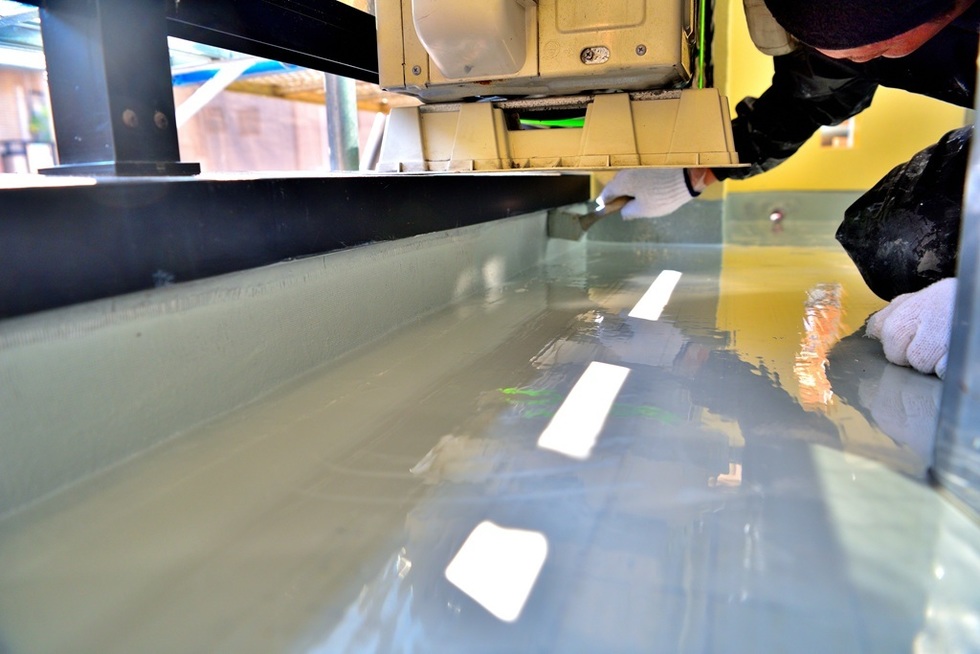 1度目と同じように粘度の高いウレタンを刷毛で塗布しています。