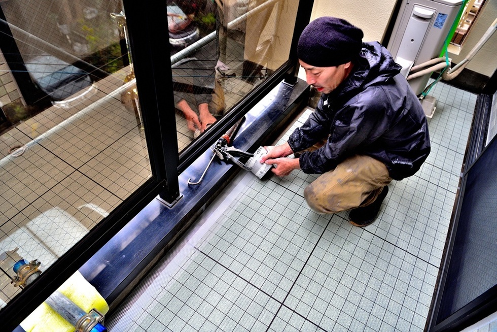 立ち上がりには補強用のメッシュシートを張り付けながら、ウレタンが下に流れ落ちないように粘度の高いウレタンを塗布します。