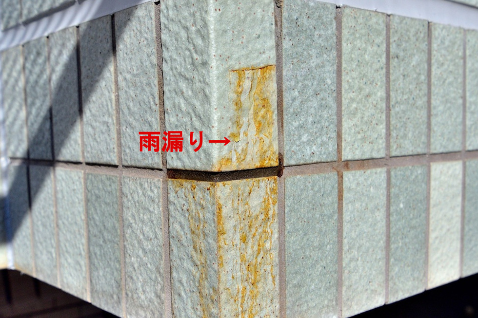ベランダ笠木と外壁タイル取り合いに散水した所、直下のタイル割ひび割れ部分から水が出てきました。