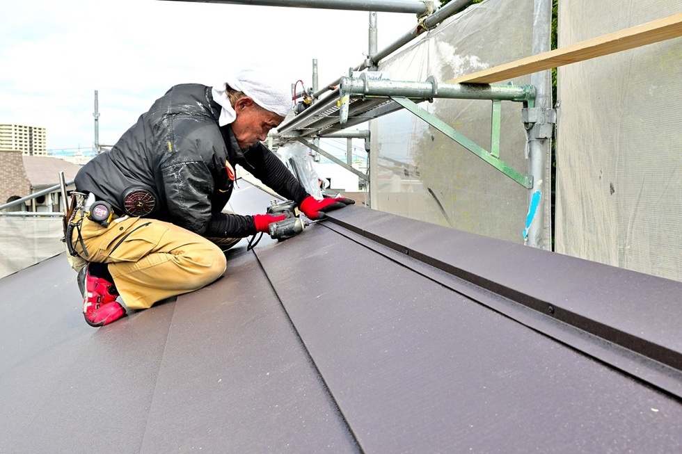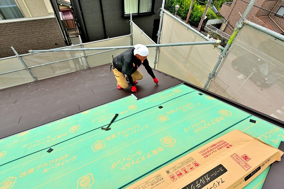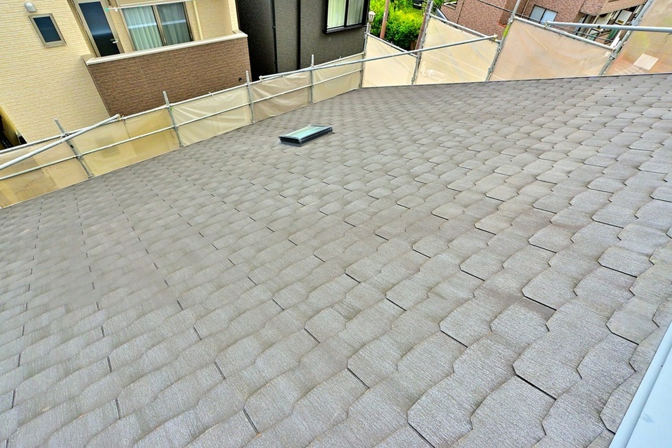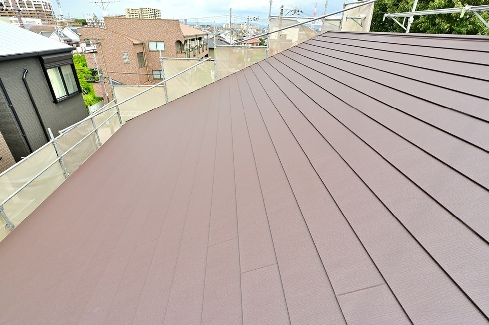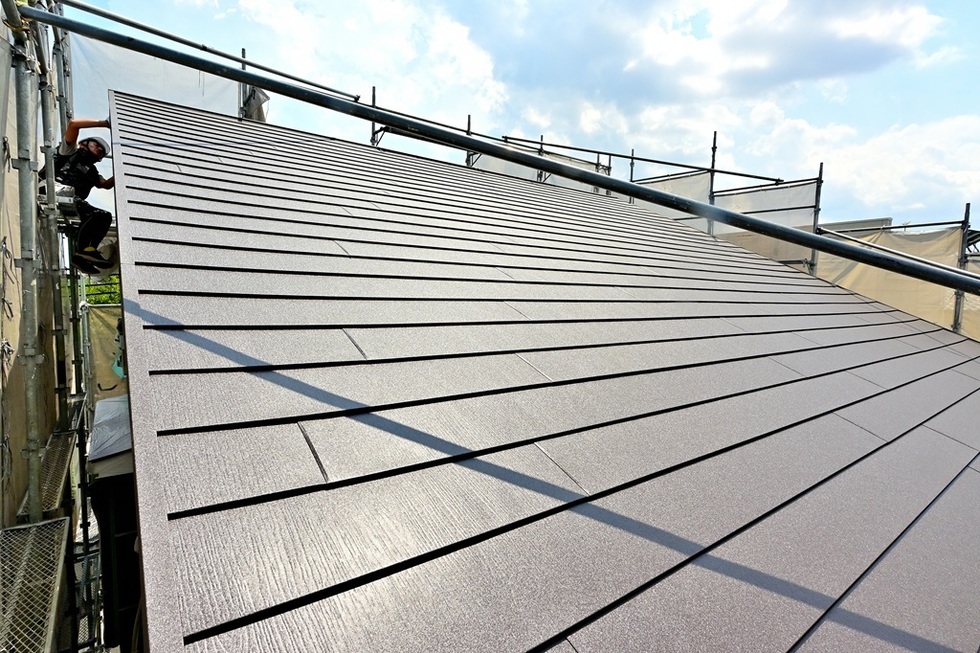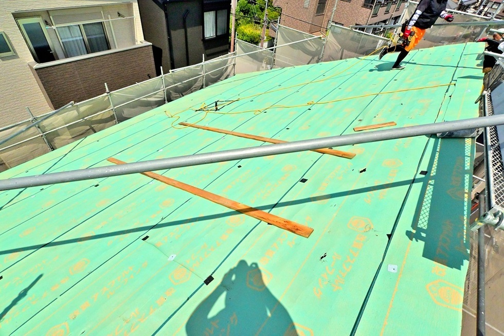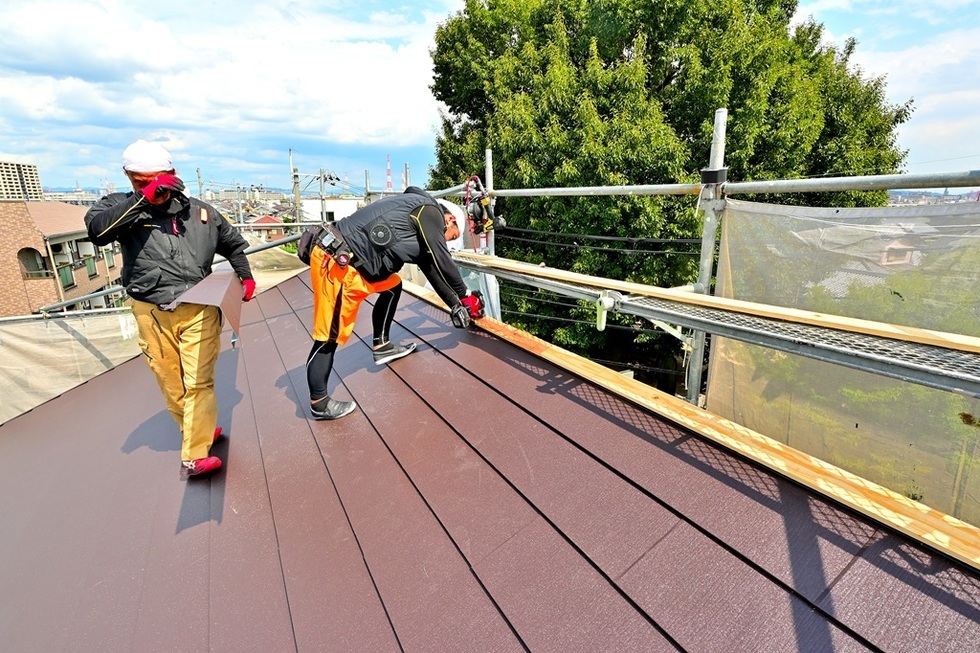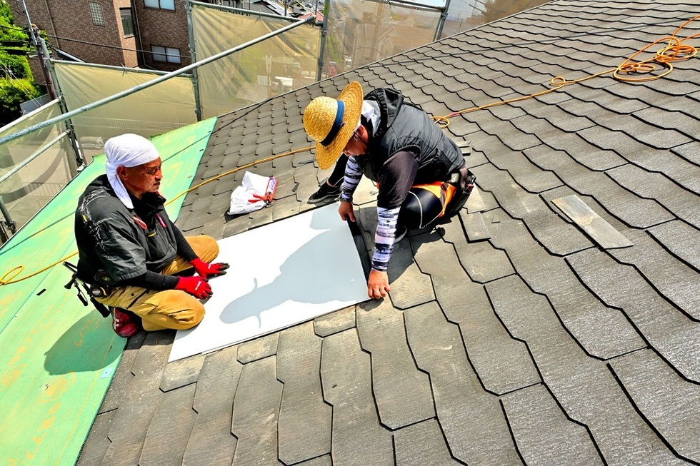 大阪市東住吉区でカラーベスト屋根の上に新規の高耐久性金属瓦を葺くカバー工法の施工例です。
